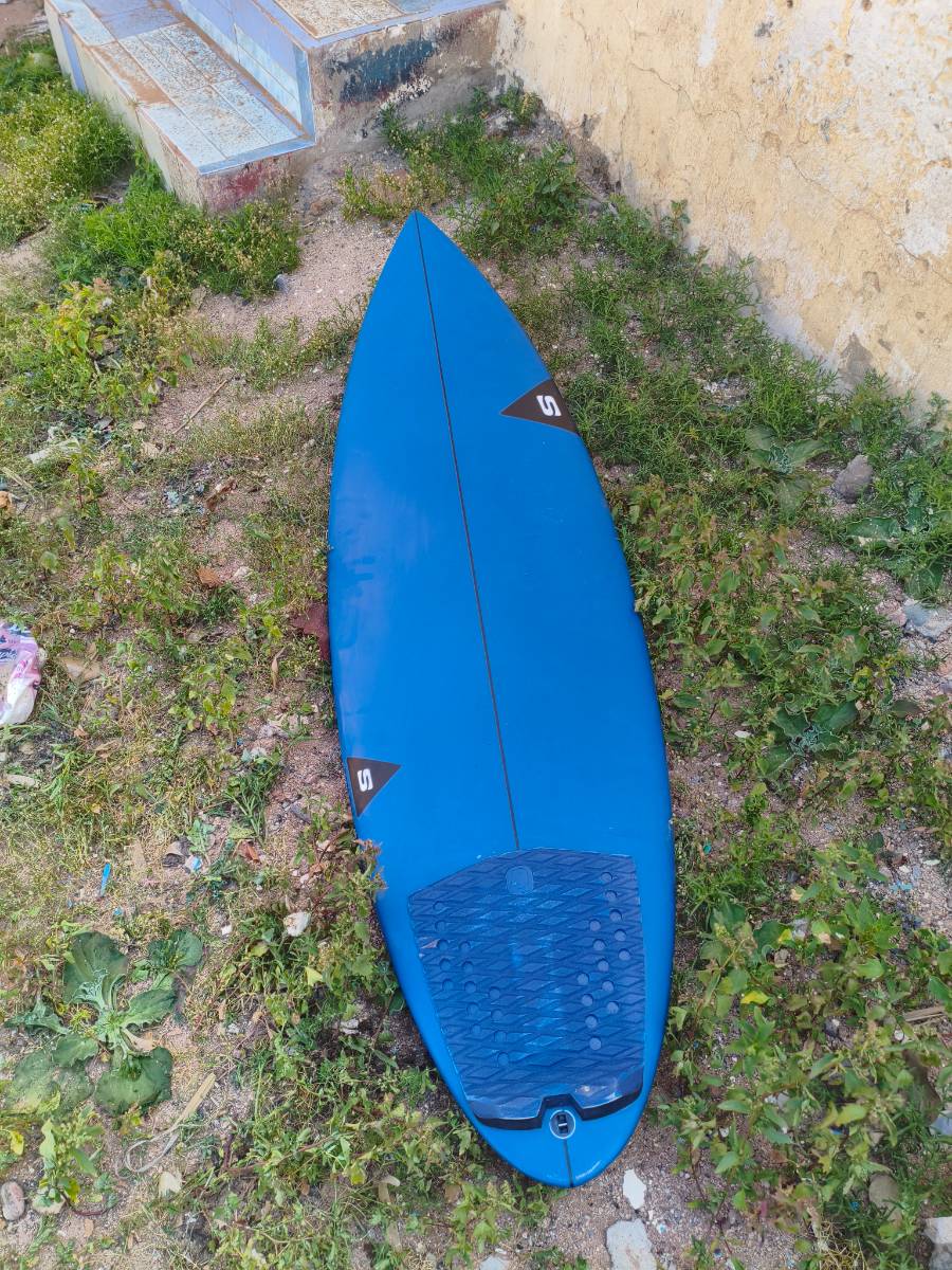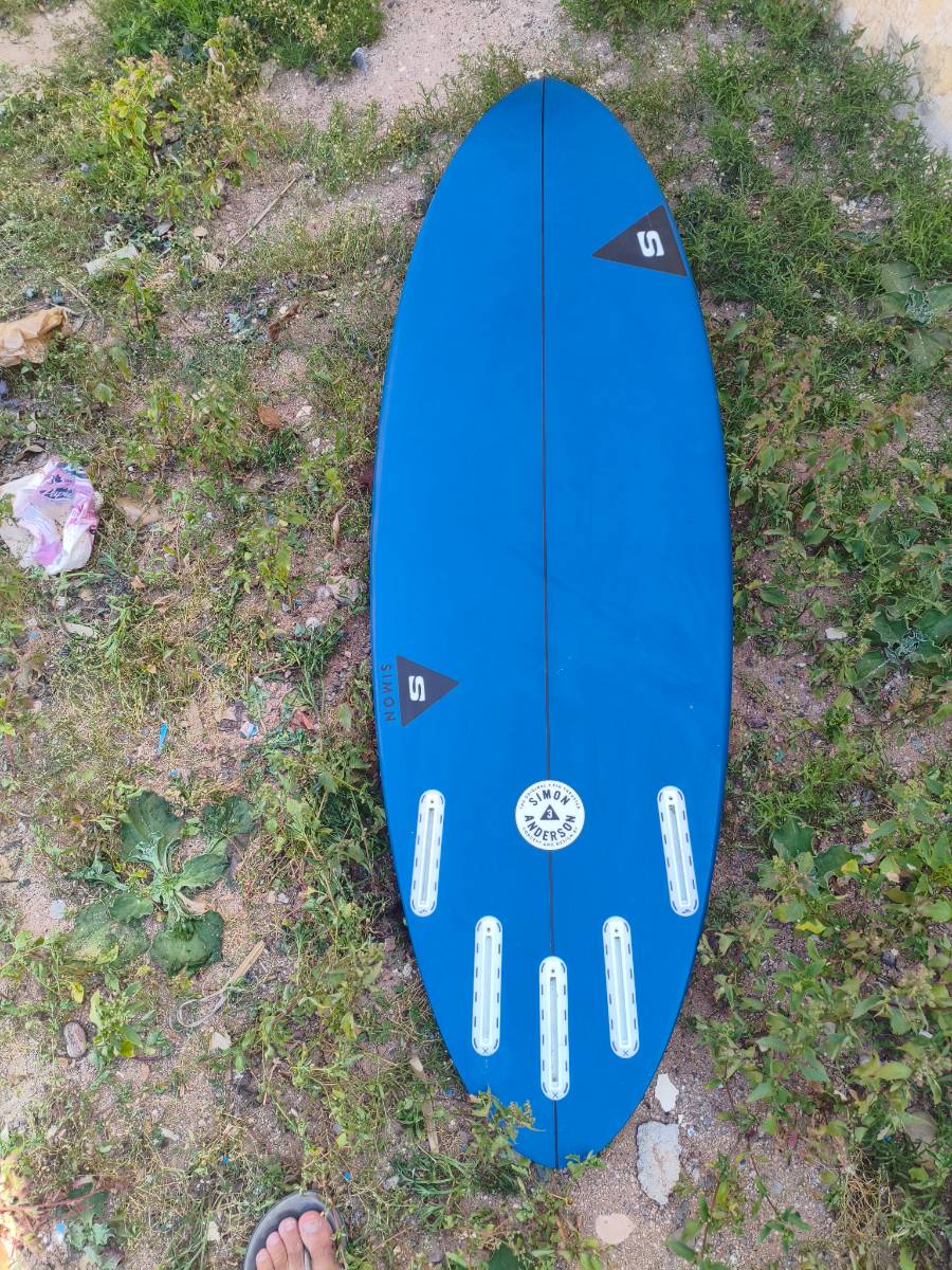 Simon Anderson Face Dancer 6'0 x 19 5/8 X 2 9/16 Somewhere around 32l I would guess. Surfed it only twice so it's close to new. Has a (fixed) micro-crack from putting the fins in and slight discoloration at the tail(from the leash "Quad option good wave Thruster. Slightly increased area in the nose, normal width in the round tail. Single concave to vee at the tail. Smooth moderate rocker. Low soft rails." Going to leave Morocco in a few days so last second price drop